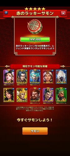 毎月三国戦争がひらかれるのて赤いコインもらえて嬉しいです。心なしか戦争の旗残しもすくなくなった……きがする?いや1700旗残ってるからきのせいか? 前回100枚コインが貯まったのですがお目当ての三国志英雄がいない為今回まで持ち越しました。 欲しい英雄…