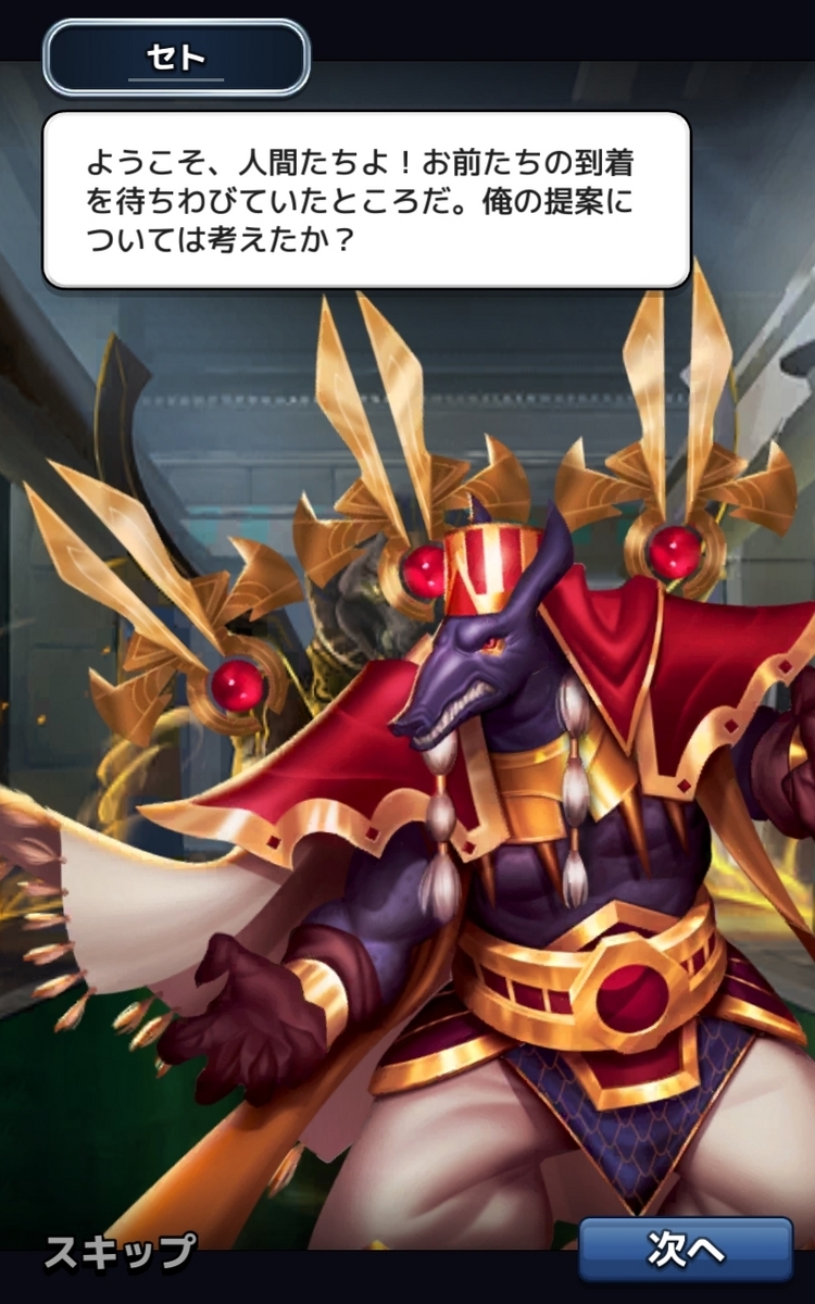 最初の戦闘はセト左右に二人のミイラを従え登場、どのキャラもスキルが痛いので要注意ですが先にセトを倒さないと左右のお供が復活してしまう。なかなか大変です。