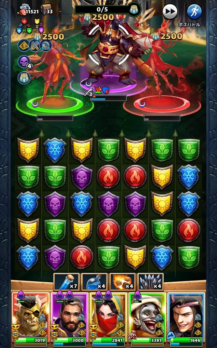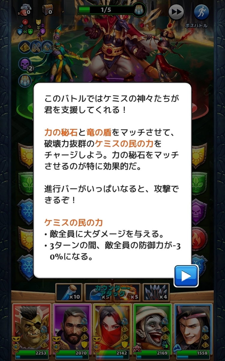 ただしパネル同時消しで発生する力の秘石などで上のゲージを貯めると全体に2500ダメージを与えられます。これをうまく利用して初戦をクリア