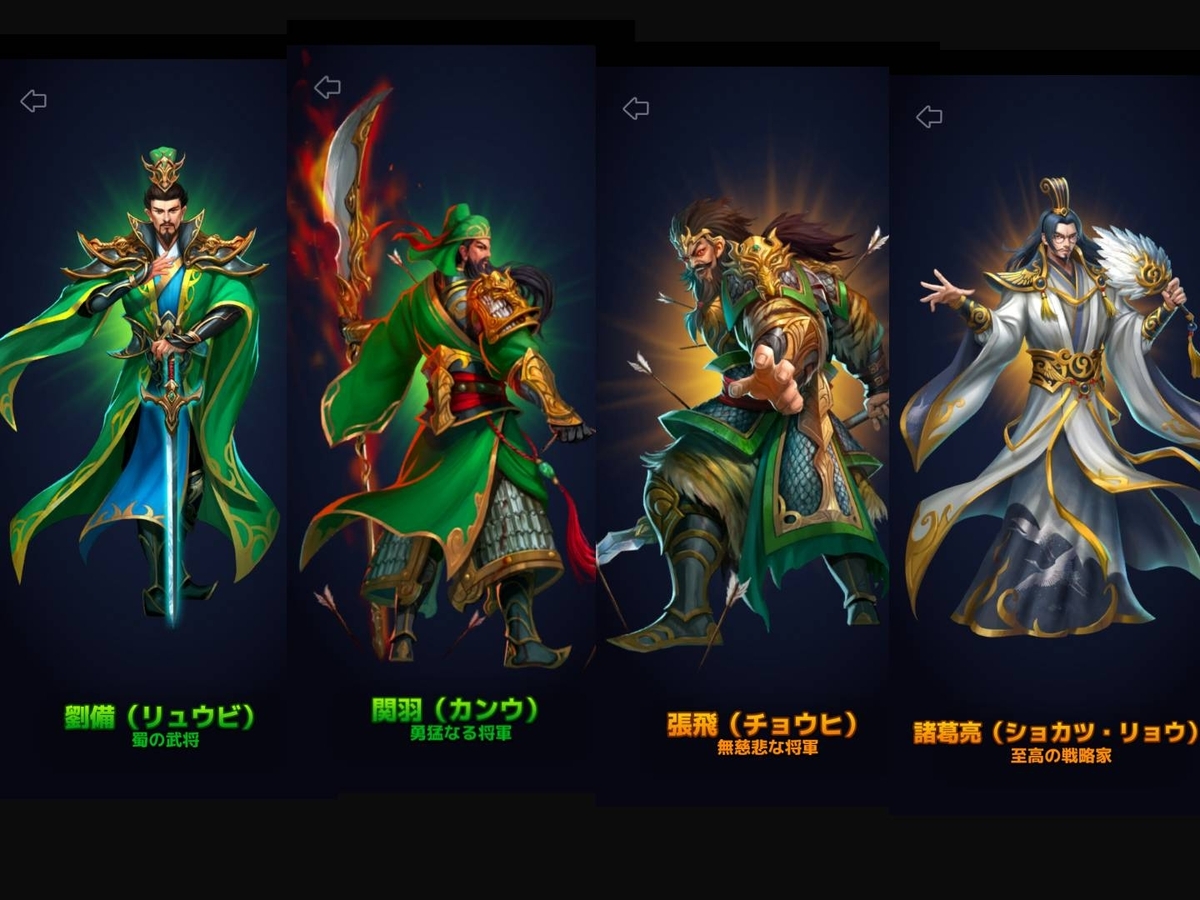 初代蜀漢皇帝、劉備玄徳。義兄弟で後に将軍、関羽雲長、張飛益徳、劉備を支えた軍師で丞相、諸葛亮孔明。エンパズにはこの四人が登場します。