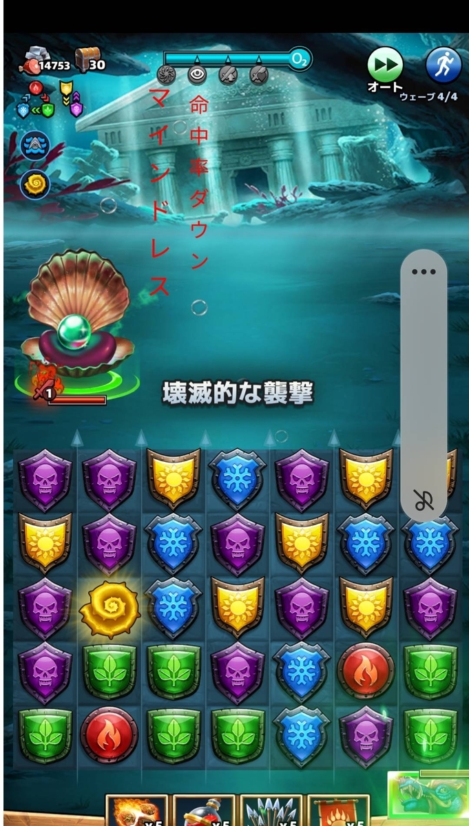 この酸素ゲージを伸ばすにはタイルマッチを4枚以上でできる特殊タイルにすると、4枚なら少し、オウム貝タイルにすると1ケージ分戻ります。