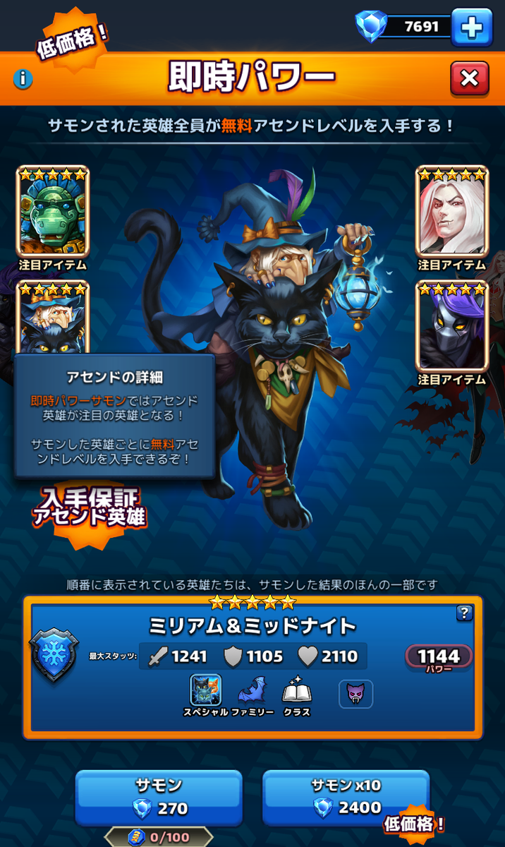 ★5をフルアセンド、リミブレ状態で手に入ると、入っている英雄は大体2年前ぐらいの英雄でコスチュームは無し。うーん微妙かなと思いましたが、ジェム安めなので少し引いてみました。
