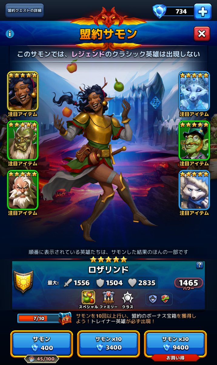 欲しかった月間のイリアーヌをゲット!全体攻撃と燃焼ダメージ性能としては合格点な英雄です。