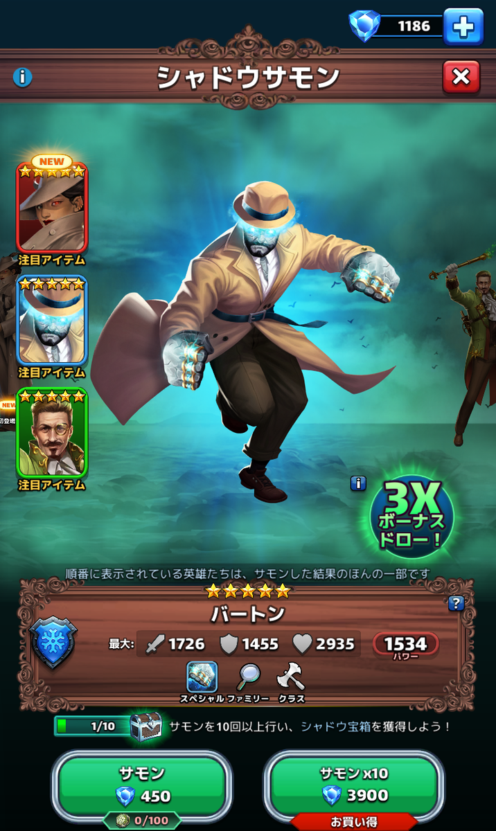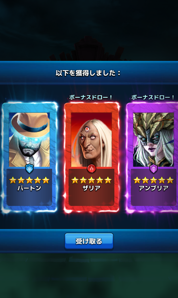 これは…これは出来過ぎですよ狂気英雄のバートン、スーパーエレメントからザリア、全体攻撃なのでイリアーヌと被ります。どっちから育てようか。アンブリアは仮面の神様チームから単体スナイパーでフィエンドを付けるフィエンドはターン経過で増殖するという
