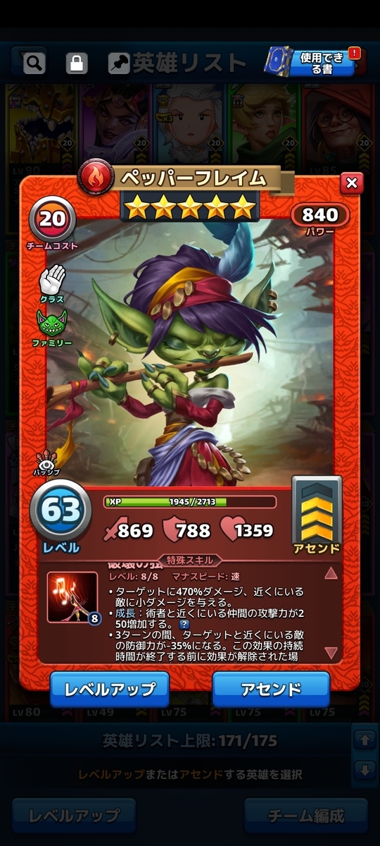 絶賛育成中です。スキルをうつとメガミニオンを召喚+敵全体に睡眠効果、ダメージ能力は皆無なので防御に全振りして良い英雄ですね。あとメガミニオンが攻撃しながら毎ターン状態異常を回復してくれる。