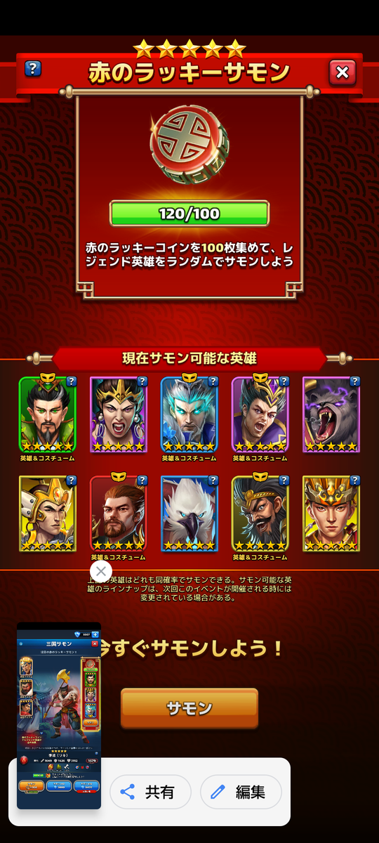 コインについても今回もハズレでした。★4周瑜のコスチュームでいいから欲しいなあ