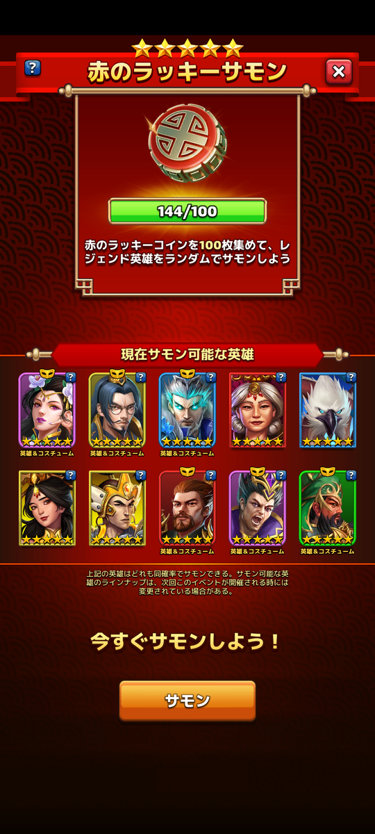 前回100枚コインが貯まったのですがお目当ての三国志英雄がいない為今回まで持ち越しました。